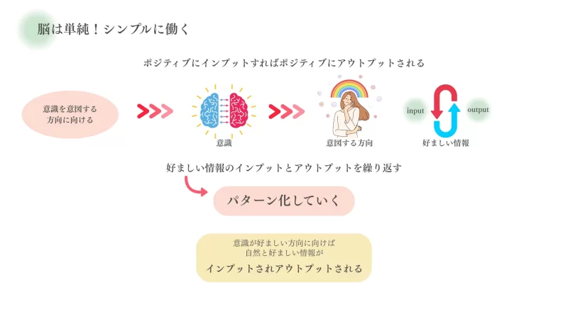 そして脳の仕組みは至ってシンプルなので、ポジティブな内容で脳がインプットするとポジティブなものが脳からアウトプットされます(セッション用の資料なので見づらいかも)